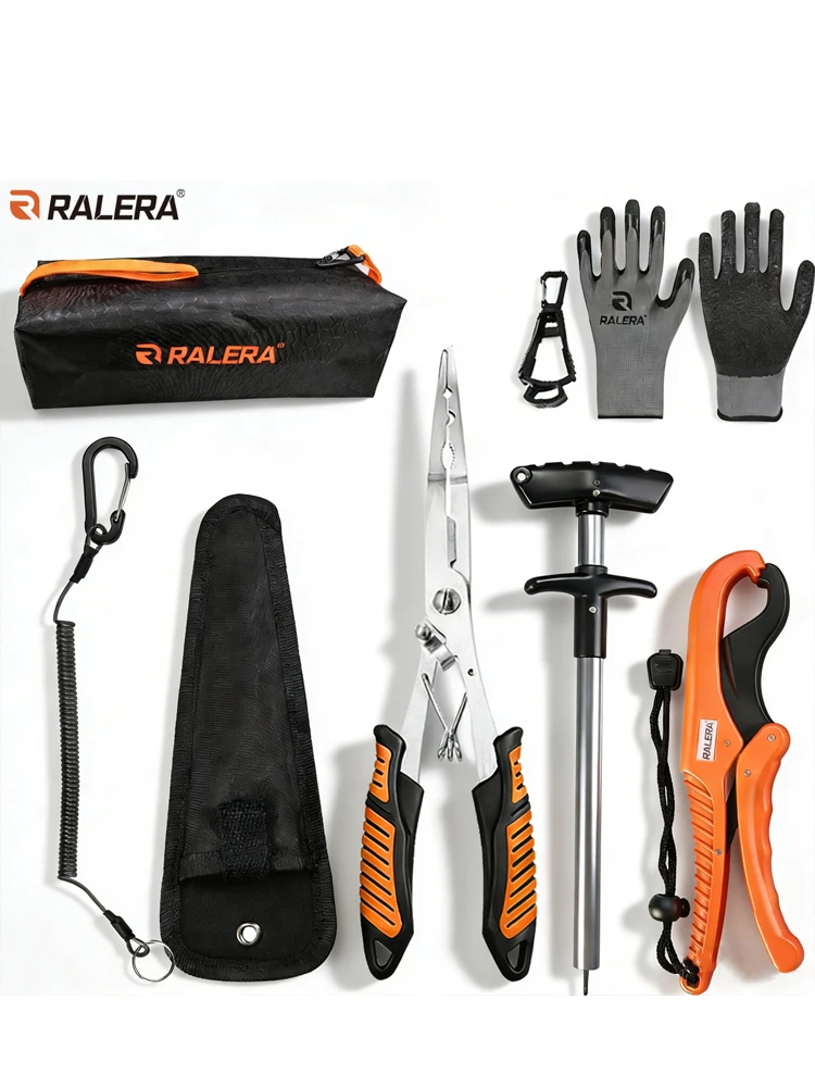 The set includes a line cutter, ring opener, fishing pliers, fish clamp, and a storage bag, providing all you need for a successful fishing trip.